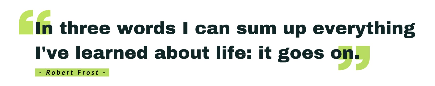 Đây là câu quote mình chọn trong tuần. Một câu nói của Robert Frost: “Chỉ trong 3 từ, tôi có thể tóm gọn tất cả những gì mình học được về cuộc sống: nó vẫn tiếp diễn”.