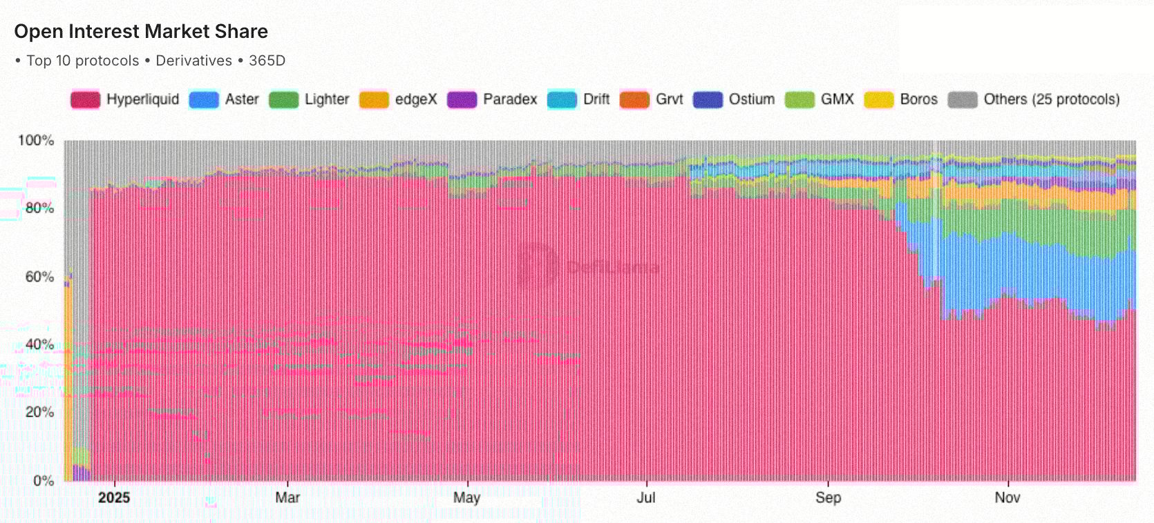 Một số dự án đối thủ đem lại môi trường trade Perp với hiệu suất gần bằng hoặc tương đương với Hyperliquid và còn offer thêm những món hấp dẫn khác như: fee giao dịch bằng 0 + cơ hội airdrop → đã dẫn tới thị phần Hyperliquid giảm đi thấy rõ.