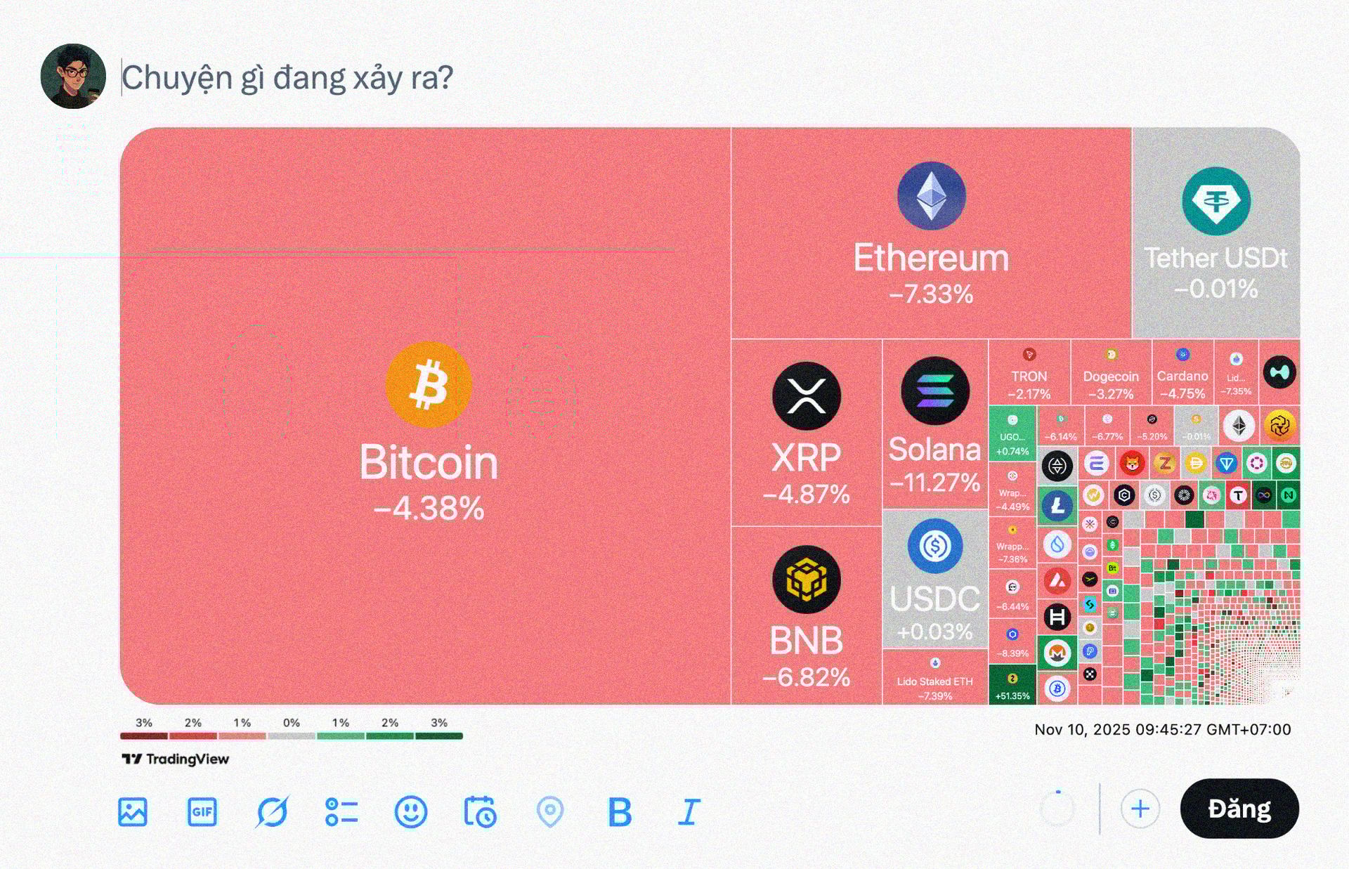 Những câu chuyện, xu hướng trong thị trường crypto 2 tuần rồi đều đang bị chặn lại bởi một mối quan tâm lớn hơn là khả năng tăng trưởng chung của thị trường. Nên tuần rồi mình không thấy một sự vật, hiện tượng nào thực sự đặc biệt để gọi là spotlight của tuần. Thay vào đó, đáng chú ý nhất lại là một cái chart tới từ Galaxy Research: “Mức sụt giảm của top 100 đồng crypto kể từ ngày 1/1/2024”.